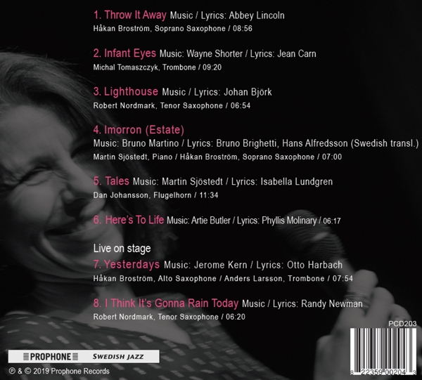 | Description: | : , Music By, Lyrics By: Abbey Lincoln, Soprano Saxophone: Håkan Broström, Lyrics By: Jean Carn, Music By: Wayne Shorter, Trombone: Micha? Tomaszczyk, Music By, Lyrics By: Johan Björk, Tenor Saxophone: Robert Nordmark, Lyrics By: Bruno Brighetti, Lyrics By [Swedish Translation]: Hans Alfredsson, Music By: Bruno Martino, Piano: Martin Sjöstedt, Soprano Saxophone: Håkan Broström, Flugelhorn: Dan Johansson (3), Lyrics By: Isabella Lundgren, Music By: Martin Sjöstedt, Lyrics By: Phyllis Molinary, Music By: Artie Butler, Alto Saxophone: Håkan Broström, Lyrics By: Otto Harbach, Music By: Jerome Kern, Trombone: Anders Larson (3), Music By, Lyrics By: Randy Newman, Labelcode PROP203.2 (PCD203), Phonographic Copyright (p) Prophone Records AB, Copyright (c) Prophone Records AB, Recorded At S:t Eriksplan 1 |