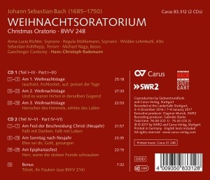 | | Description: | Originally written for the three days of Christmastide 1734 and the beginning of 1735, Johann Sebastian Bach's Christmas Oratorio has since gone on to become an established part of Advent and Christmas - just like turkey and Christmas pudding. With soloists Regula Muhlemann, Anna Lucia Richter, Wiebke Lehmkuhl, Sebastian Kohlhepp, and Michael Nagy, the newly-formed enembles of the Gaechinger Cantorey conducted by Hans-Christoph Rademann celebrate their first Christmas Oratorio together with this recording of all six cantatas! The newly-founded baroque orchestra and the newly-constituted choir of the Bachakademie will perform under the joint name GAECHINGER CANTOREY from now onwards. Based on the historic foundations of the Bach era, and with roots in the living performance history of the choir founded by Helmuth Rilling, this name represents an integrated musical approach and the aesthetic sound ideal of the baroque., Runningtime: 00:00:00, Labelcode CARU83312.2 |  | | N° de titres: |