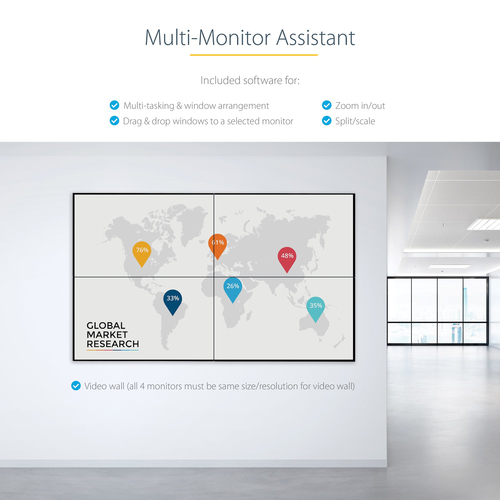 Adaptateur vidéo externe USB 3.0 - 4x 1080p - quatre moniteurCet adaptateur USB 3.0 vers HDMI® vous permet d'étendre votre bureau en ajoutant quatre moniteurs ou écrans HDMI indépendants à un ordinateur portable ou de bureau via un seul connecteur USB Type-A.Boostez votre productivitéCet adaptateur USB-A vers 4 HDMI dispose de quatre sorties vidéo pour augmenter votre productivité grâce à une plus grande surface d'écran. Avec plusieurs moniteurs, vous pouvez accéder à plusieurs applications simultanément et travailler sur un écran tout en visualisant des documents de référence sur l'autre. Utilisez l'adaptateur USB vers HDMI pour plusieurs moniteurs pour étendre ou refléter vos écrans, ou créer un mur vidéo accrocheur.Vidéo et audio haute résolutionGrâce à l'interface USB 3.0, ce dongle adaptateur à quatre moniteurs offre des résolutions HD allant jusqu'à 1920 x 1080 (1080p) sur les quatre ports. L'adaptateur prend également en charge l'audio 2 canaux sur HDMI. Simple